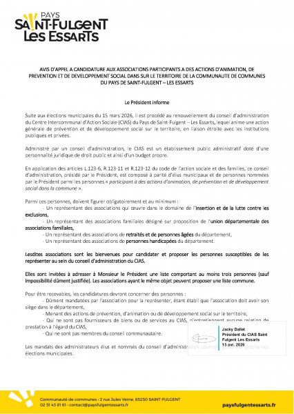 Le CIAS du Pays de Saint-Fulgent - Les Essarts lance un appel à candidatures pour renouveler son Conseil d’Administration.